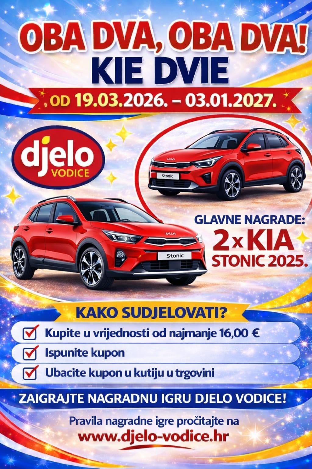 Sudjelujte u Djelo Vodice nagradnoj igri koja Vam donosi glavnu nagradu dva automobila KIA Stonic te super nagrade od kojih su 2 električna romobila i 2 bicikla